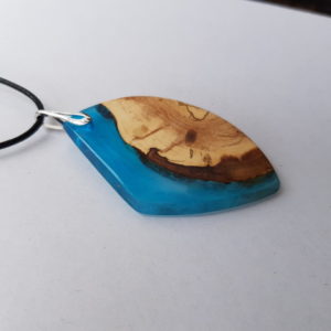 Dřevěný šperk z dřeva jabloně v kombinaci s průhlednou tyrkysovou pryskyřicí. Velikost 6 – 3,7 – 0,5 cm. Doporučený závěs na šňůrce imitace kůže délky 46 cm, tlouštky 2 mm. Šperk je dodáván v dárkové krabičce s certifikátem originality, podepsaný autorkou.