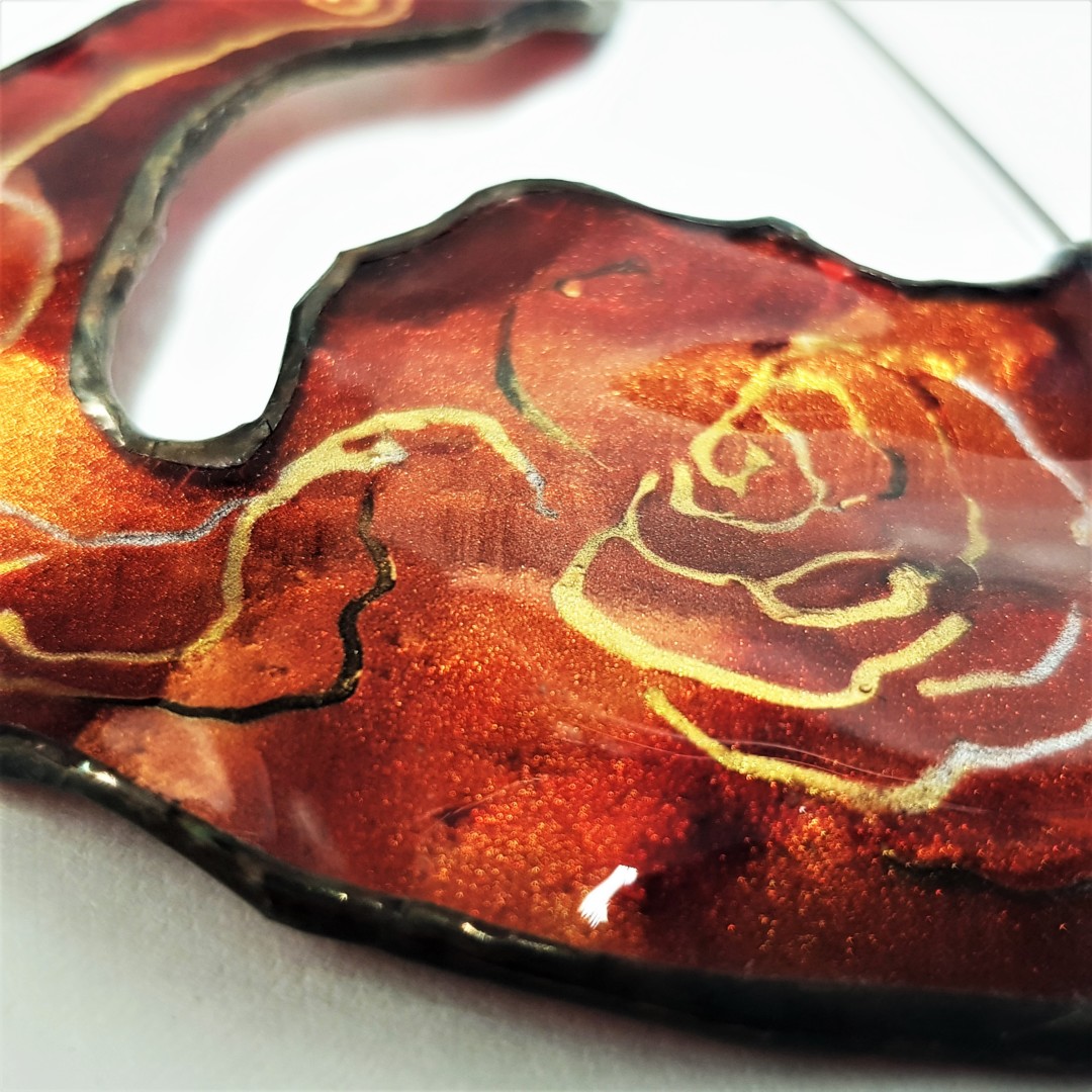 Skleněný šperk,který byl vytvořen vyřezáním tvaru, následně leháním v peci kde je vytvořena plasticida tvaru a konečnou úpravou podmalovaním speciálními barvami. Zakončen je cínováním.Velikost šperku je 7- 7 cm. Doporučený závěs je na kovové obruči průměru 15cm.
